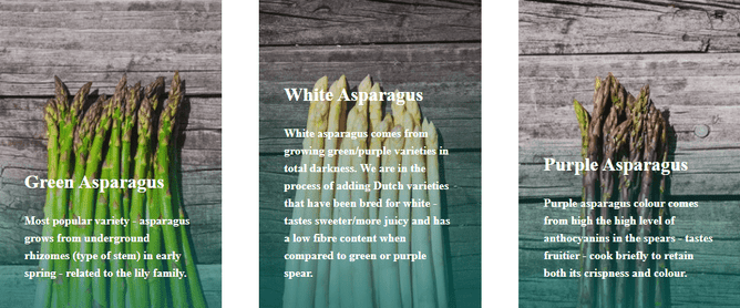 With the export market basically stopping and the local market often being flooded with asparagus they downgraded areas and decided to concentrate on organic farming along with introducing white asparagus along with the purple variety.