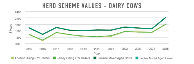 A Mixed Age Dairy cow now has a National Average Market Value of $2,111 compared to $1,609 last year – a rise of 31.2%. Rising one and two-year heifers have increased in value by