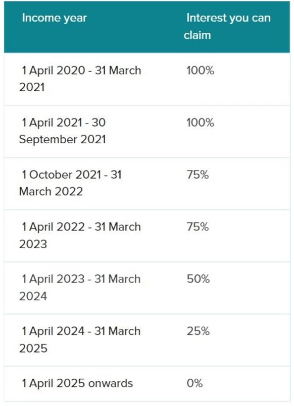 - Property acquired before 27 March 2021, the ability to deduct interest on existing loans is being phased out over 4 years, ending 31 March 2025 (see the image below). Interest deductions for any new loans drawn down on or after 27 March 2021 won't be allowed from 1 October onwards.
